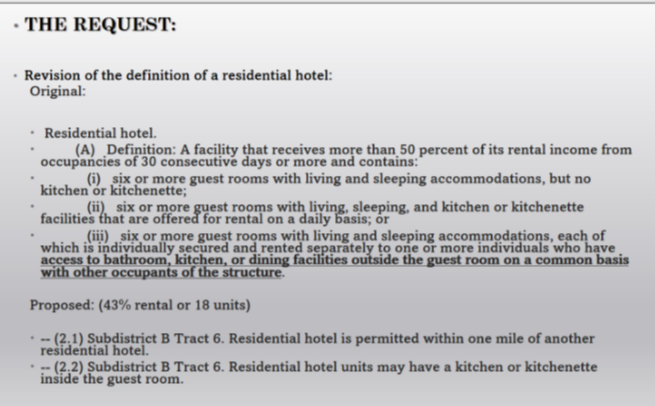 Chernock also wants to revise the definition of a boutique hotel so that guests may prepare food on-site and internal entry is not required.