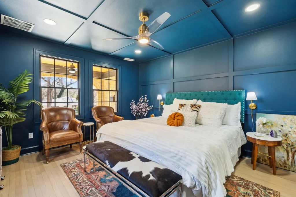 The primary suite is yet another example of how color can carry an ambiance. The bold midnight blue plays perfectly with warm hardwoods and plenty of exterior light.