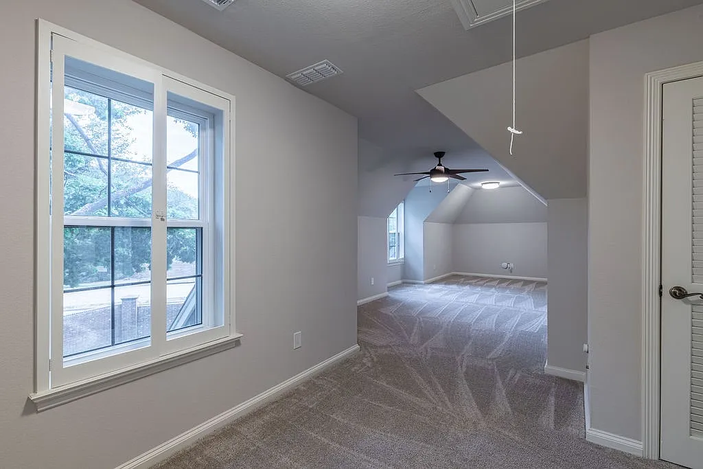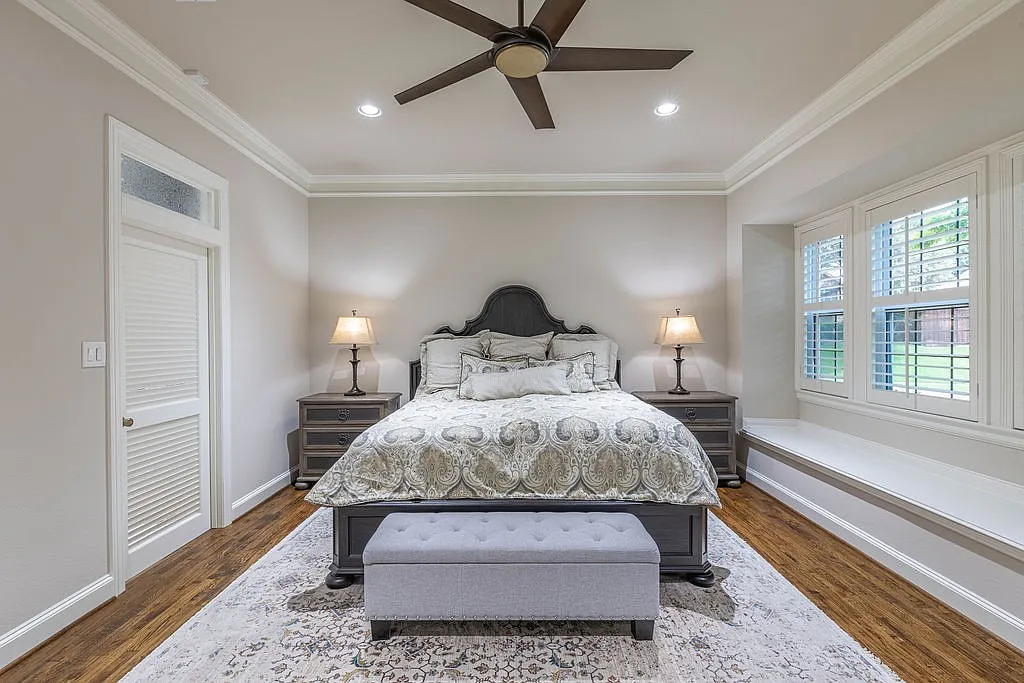 The primary suite features a cozy window ledge, plantation shutters, and plenty of space to make it yours. With picturesque neighborhood views, this room is a relaxing retreat in one of Plano’s most exceptional zip codes.