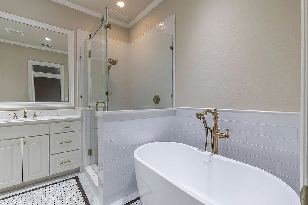 Of course, the en-suite bathroom also boasts expert updates with a chic soaking tub, sleek tilework, and a standing shower.