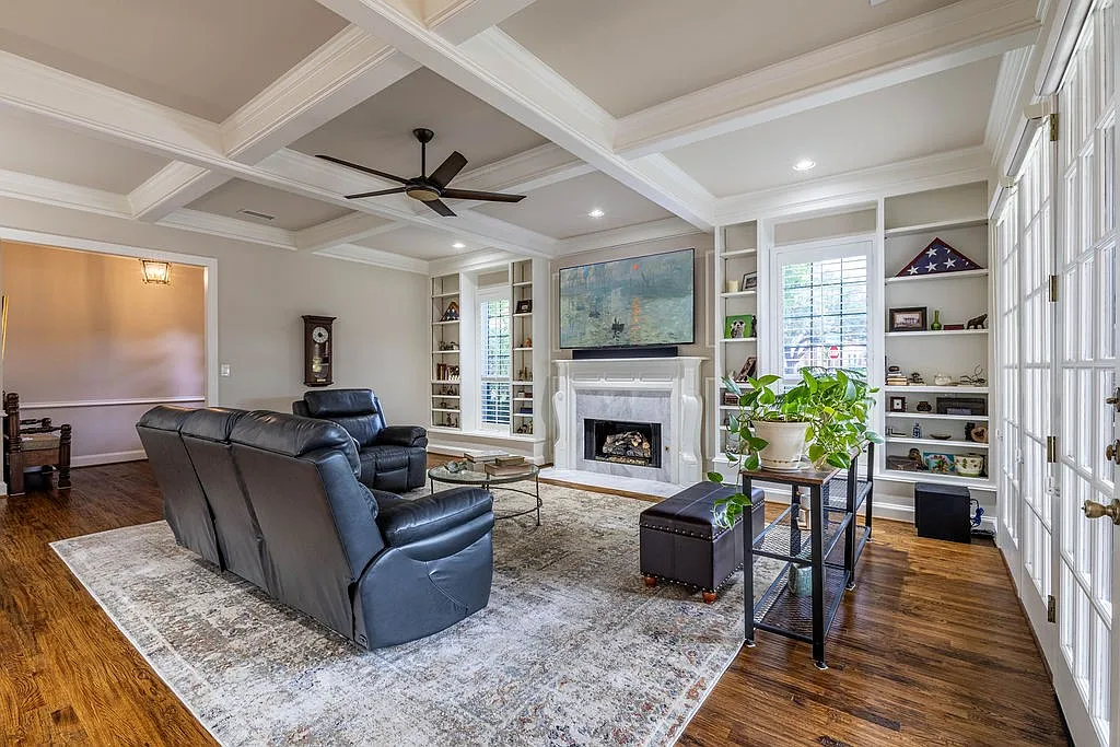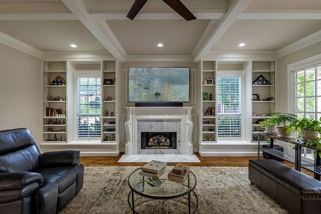 The layout leads you immediately into a regal, well-lit formal living area. Here, a sophisticated marble hearth serves as a centerpiece, allowing you to convene comfortably amongst big, open windows and soaring ceilings.