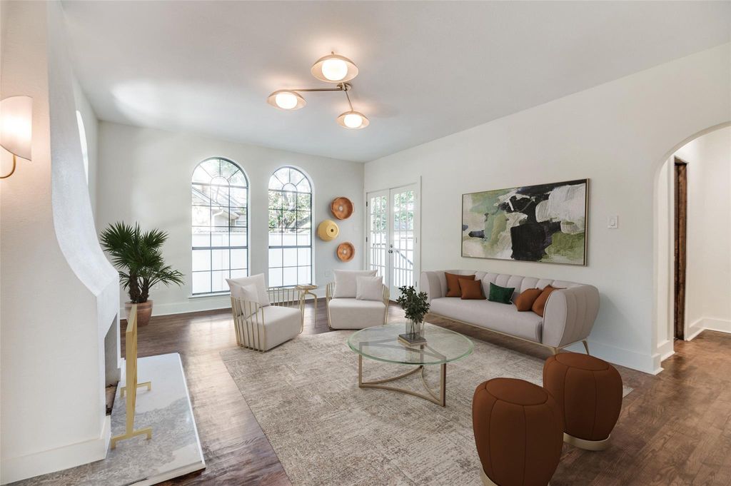 Inside, a lovely formal living room maintains its old world charm while still feeling light, bright, and modern. The coved gas fireplace is a particularly nice touch, a nod to the Spanish Colonial style of the home and a stunning piece of work. The room is nicely framed by arched windows and has French doors leading to the backyard.