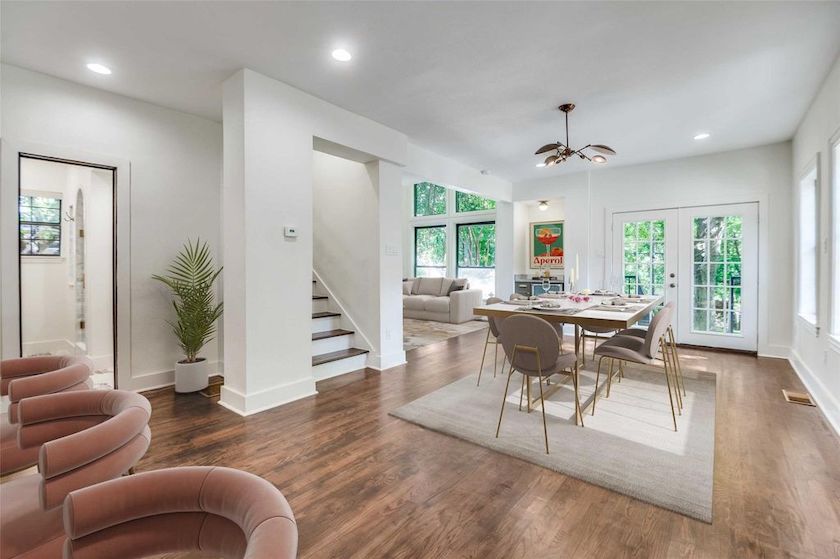 The dining area has plenty of room for a sizeable table, a flexible space for large or small gatherings. I love this view of the space that captures both the natural light and the view of all the trees through the windows.