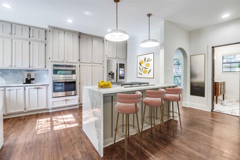 This gorgeous kitchen has a fun and convenient countertop that seats three, and also functions as a cooktop. This fully updated space has beautiful quartz countertops with a waterfall and matching backsplash, a farm sink, double convection ovens, and a 5-burner gas cooktop with downdraft.