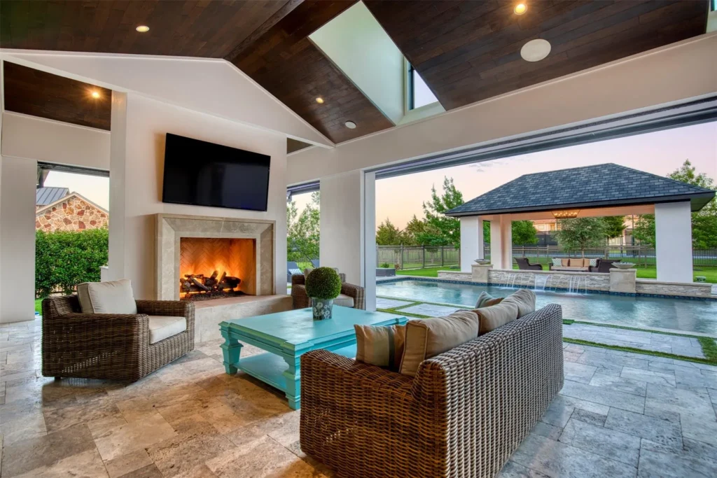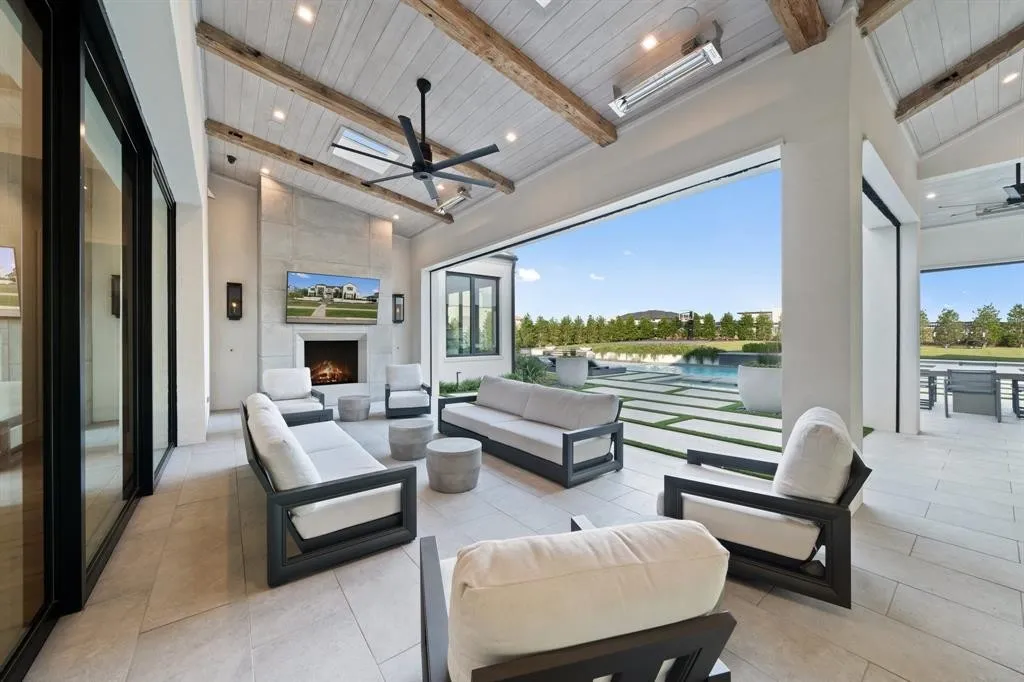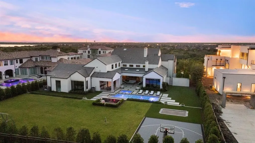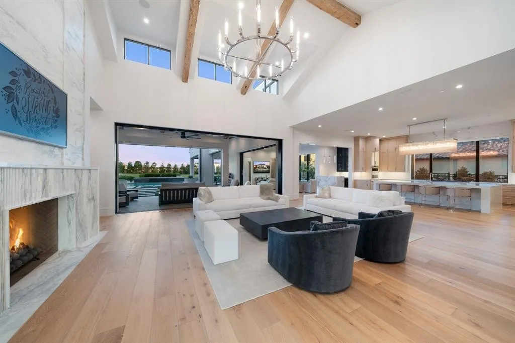 “This completely custom-built home by Alford Homes is a seamless fusion of modern luxury and functional design, set on nearly an acre of resort-style grounds. A wall of motorized glass pocket doors open to the outdoor living space, effortlessly extending the interior footprint. The nearly one-acre lot includes a sparkling pool and spa, an in-ground trampoline, basketball court, and a sunken fire-pit lounge that creates an unforgettable setting for entertaining.”