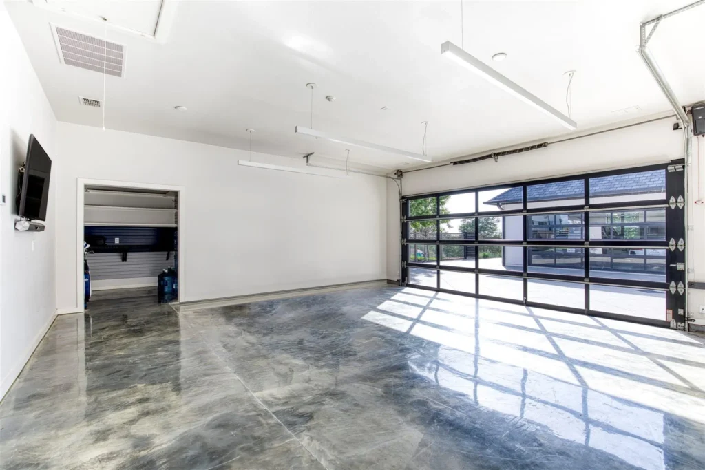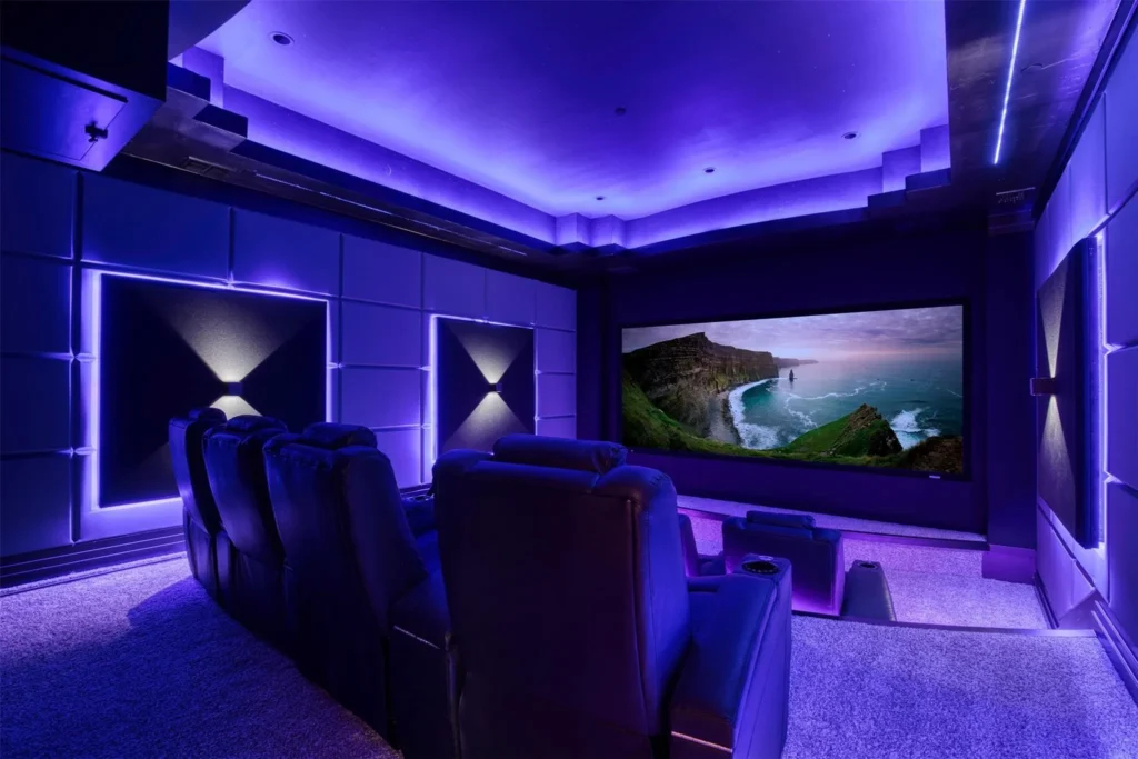 A theater room with tiered rows of seating, state-of-the-art sound, LED lighting, a starry ceiling, and soundproofing-wrapped walls. A five-car garage with HVAC in the two-car, perfect for gym, golf simulator, or one of your five cars.